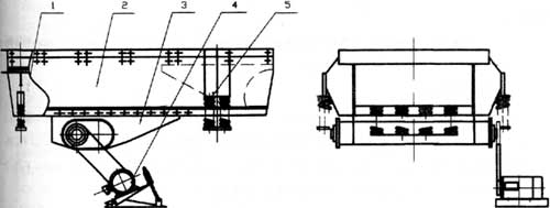 ZSW系列振動喂料機(jī)是利用兩個呈特定位置的偏心軸以齒輪相嚙合而組成激振器,裝配時必須使兩齒輪按標(biāo)記相嚙合,然后通過電機(jī)驅(qū)動,使兩偏心軸旋轉(zhuǎn),從而產(chǎn)生巨大合成的直線激振力,使機(jī)體在支承彈簧上作強(qiáng)制振動,物料則以此振動為動力,在料槽上作滑動及拋擲運動,從而使物料前移而達(dá)到給料目的。當(dāng)物料通過槽體上的篩條時,較小的料可通過篩條間隙而落下,可不經(jīng)過下道的破碎工序,起了篩分的效果。產(chǎn)品結(jié)構(gòu)及技術(shù)參數(shù)